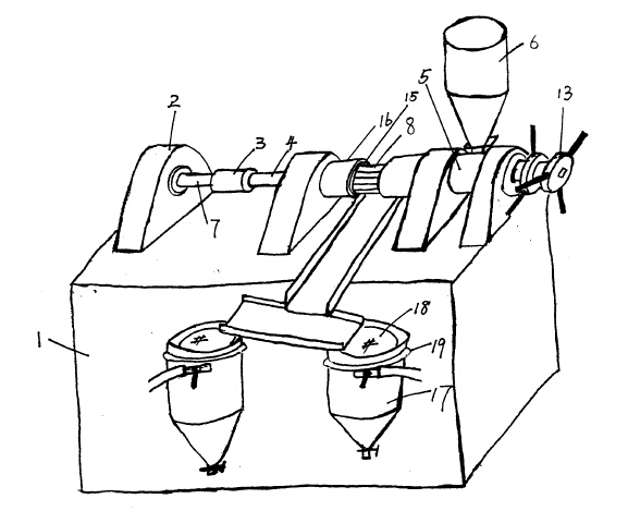 螺旋榨軸穿過料筒,并通過連軸節(jié)與減速箱動力輸出軸相連,螺旋榨軸的錐型前端和料筒前端的錐型縮口相配合形成擠出間隙,料斗放置在料筒上,并與料筒連通,螺旋榨軸的螺牙直徑保持恒定,螺旋榨軸螺谷從后端到前端逐漸變低,出渣口處有一錐型收縮口,通過螺旋榨軸的轉(zhuǎn)動,從料斗下來的原料沿螺谷向前運(yùn)動,并逐漸受到擠壓和摩擦,在料筒的錐型收縮口,擠壓加劇,油渣分離。油從料筒的出油口段流出,出油口段上加工有可以漏油的小孔或者縫隙,油渣從料筒錐型口擠出,錐型口處料筒和螺旋榨軸的擠出間隙可以通過螺旋榨軸后端和料筒后端之間的調(diào)節(jié)螺絲/螺母進(jìn)行調(diào)節(jié),螺旋榨軸的后端設(shè)有活動連接的螺絲,該螺絲和料筒上的固定螺母配合,螺母和料筒制成一體,料筒周邊安裝有加熱元件。加熱元件外包保溫材料,同時安裝有自動恒溫裝置對料筒周邊的加熱元件進(jìn)行溫度控制,螺旋榨油機(jī)還帶有真空濾油儲油罐,這樣使榨油過程和原料加熱同時進(jìn)行,并將出油溫度控制在適宜溫度,改變了油品質(zhì)量,減少了油的加工環(huán)節(jié)。